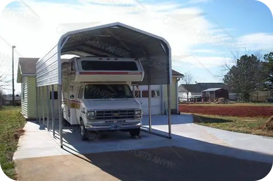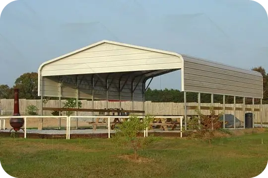 Boxed-eave combines horizontal trim and welded truss-to-leg transitions to boost support and weather sealing. It offers enhanced rigidity and refined aesthetics without the full premium framing of a vertical roof, perfect for a balance of performance and value.